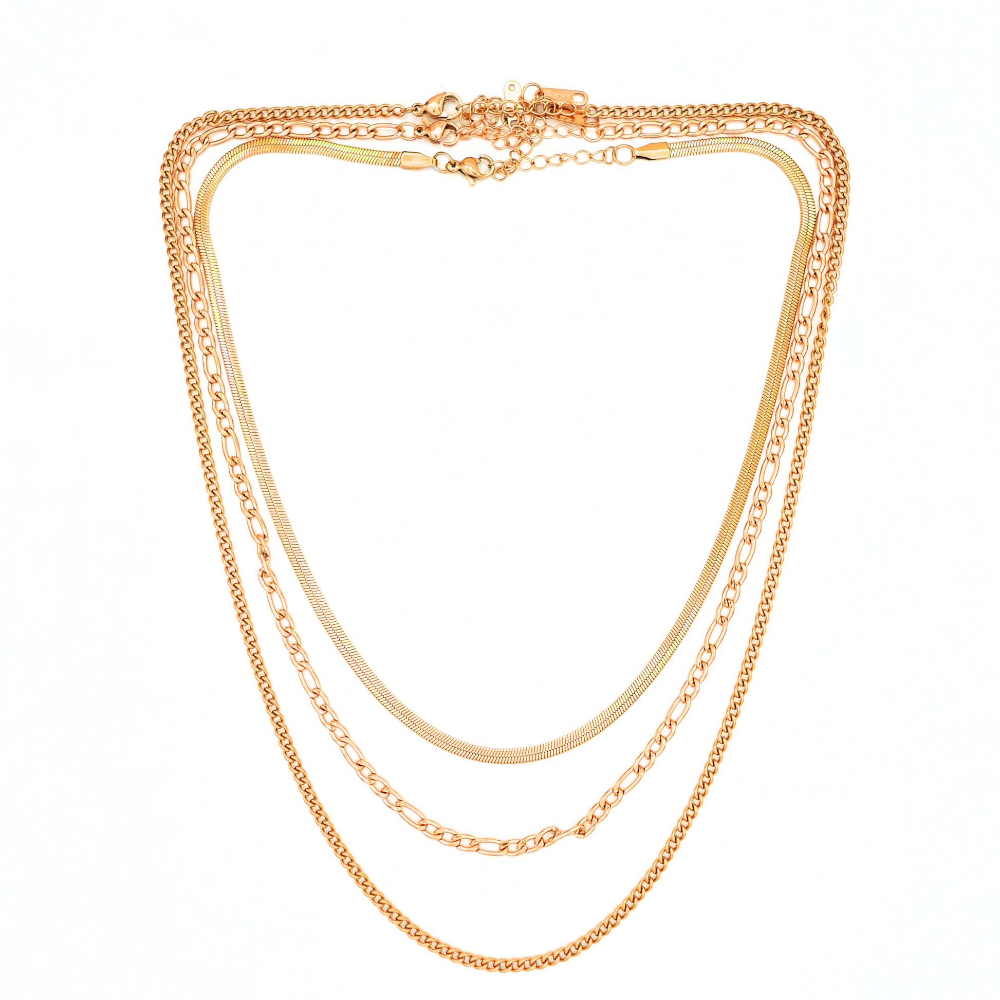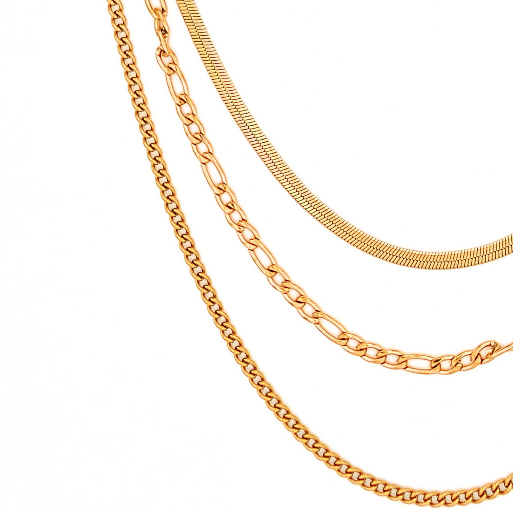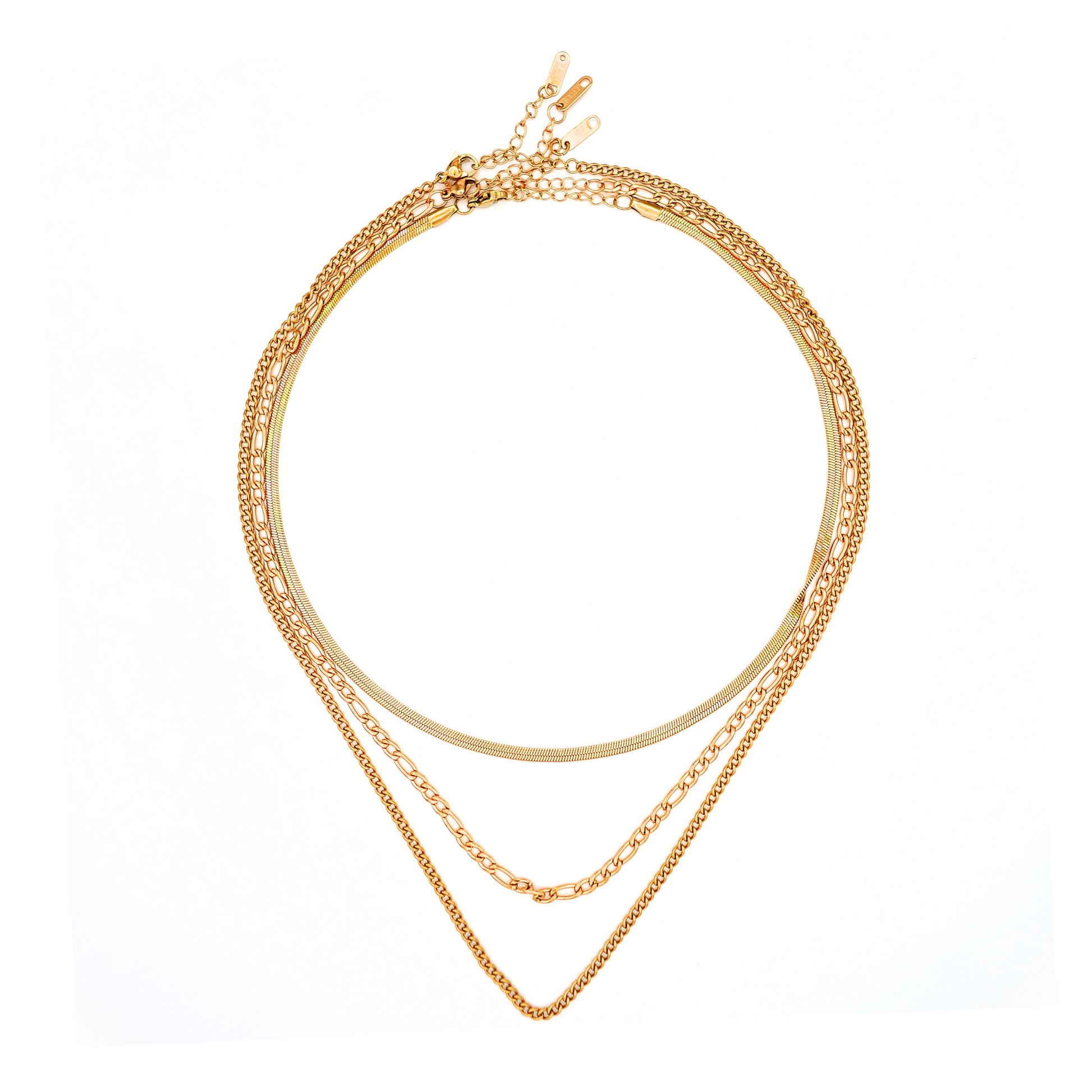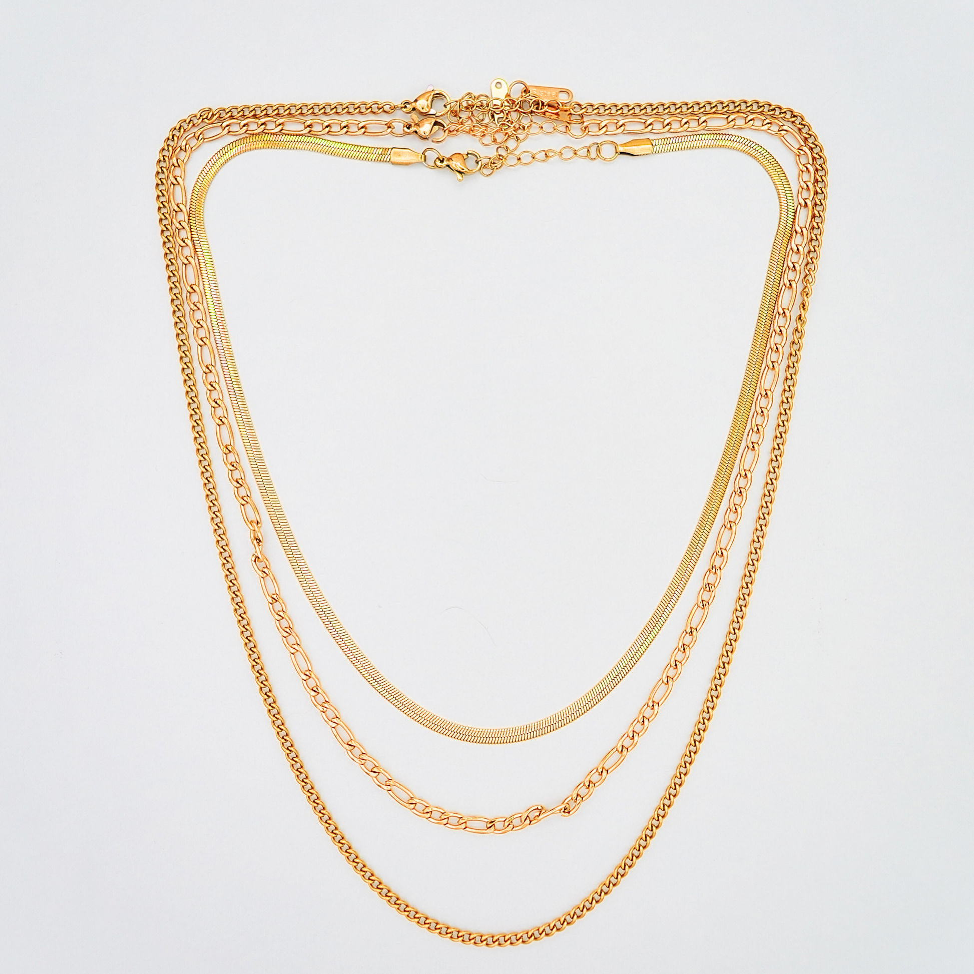 Colierul Triplie. Realizați din oțel inoxidabil 316L și placați cu aur de 18K, sunt rezistenți la apă, nu se oxidează și sunt hipoalergenici – concepuți pentru a fi purtați zilnic, fără decolorare sau disconfort.